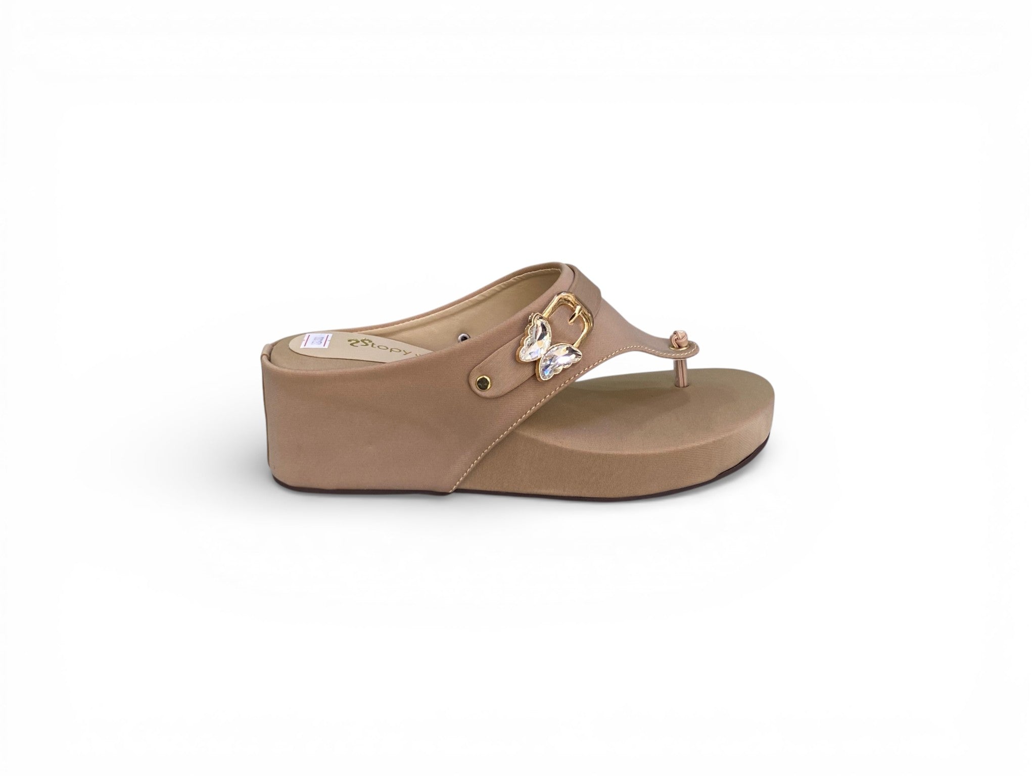 Elegant wedge sandals that blend modern style with everyday comfort. The smooth synthetic leather thong upper features a striking gold-toned butterfly buckle for a refined metallic accent. A contoured, extra-soft cushioned footbed and medium-height platform wedge provide stability and subtle lift without compromising ease of movement. The versatile neutral tone transitions effortlessly from casual daytime wear to polished evening occasions, making these sandals a wardrobe essential for any season.