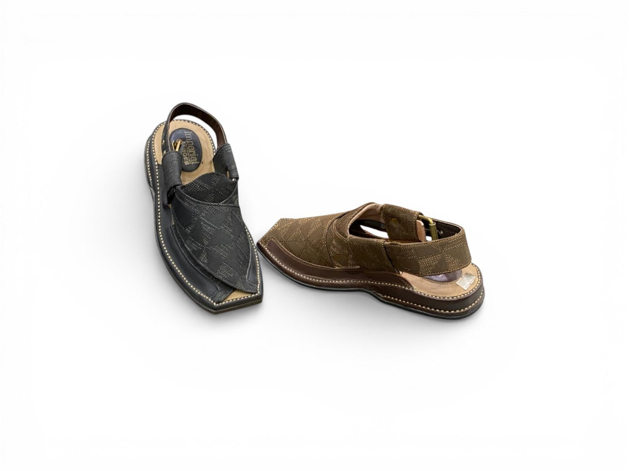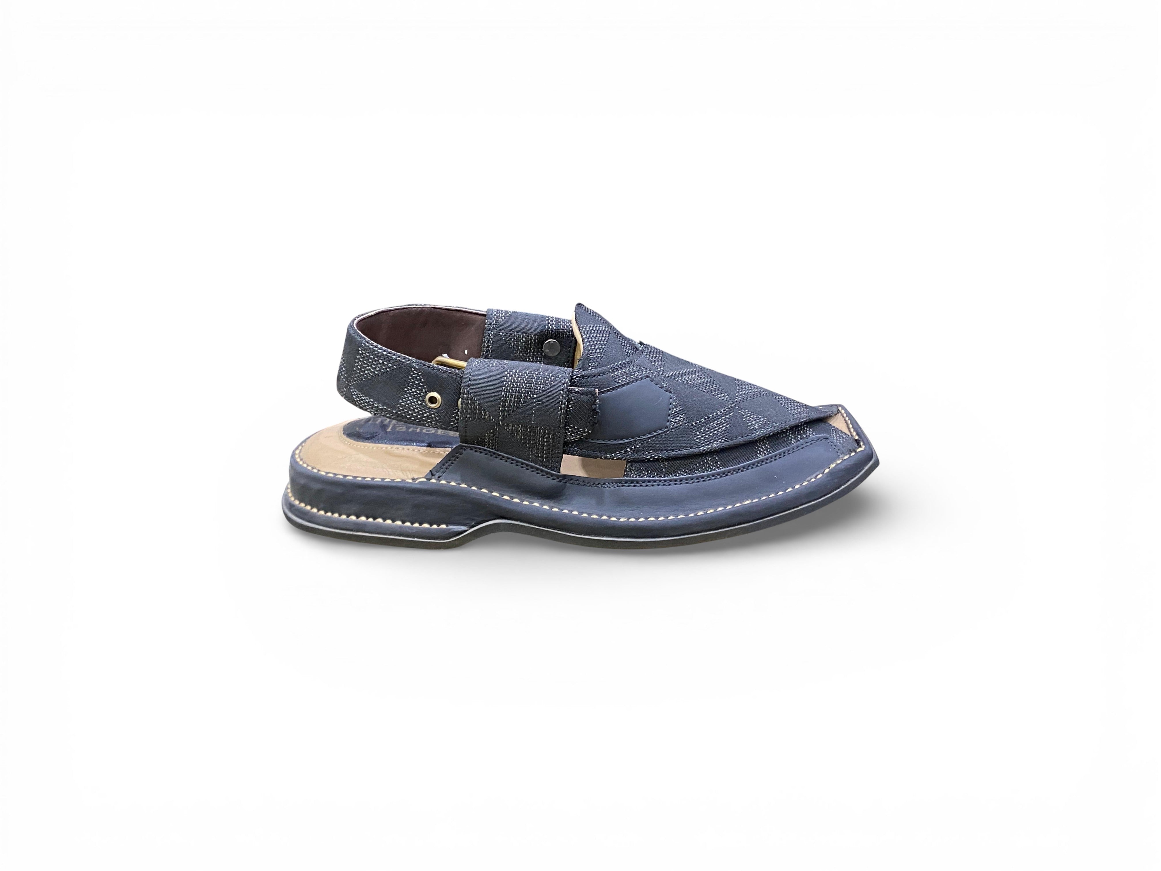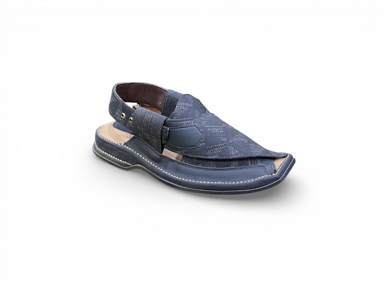 Discover authentic craftsmanship with our Peshawari Chappal, a handcrafted semi-closed sandal that honors Pakistani heritage while embracing contemporary style. The navy blue textured leather upper showcases traditional Zalmi design with dual crisscross straps and a distinctive square-toe profile. An adjustable metallic buckle heel strap ensures a secure, personalized fit for any foot shape. Built with a high-grip recycled rubber sole, this durable chappal transitions seamlessly from everyday wear to formal occasions—weddings, festivals, and celebrations. Pair it with traditional Shalwar Kameez or modern casual attire. Engineered for comfort and longevity, it handles diverse terrains while maintaining the authentic character that makes Peshawari chappals a timeless cultural staple.