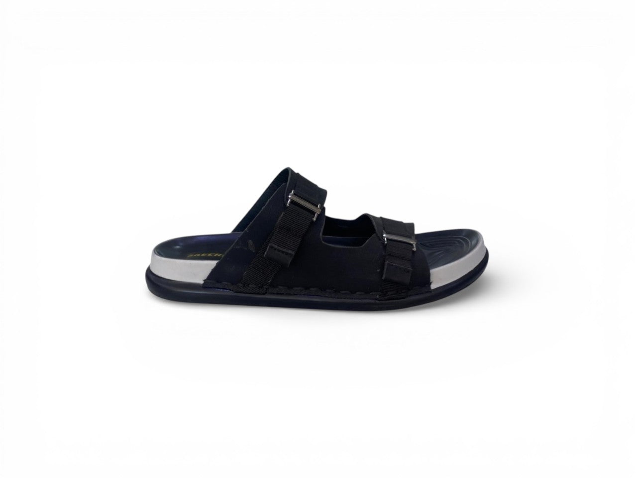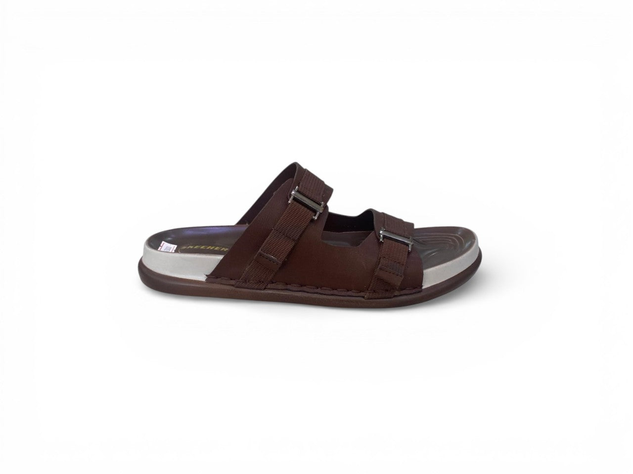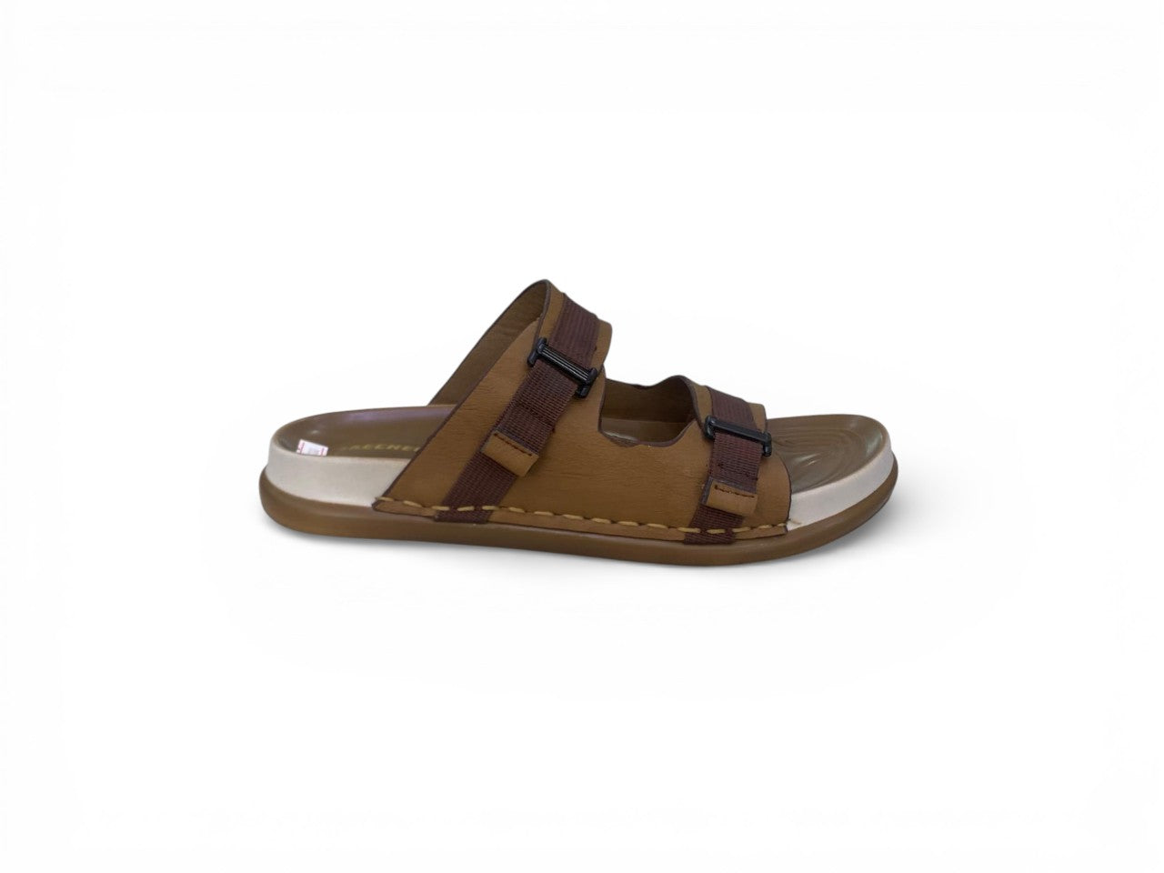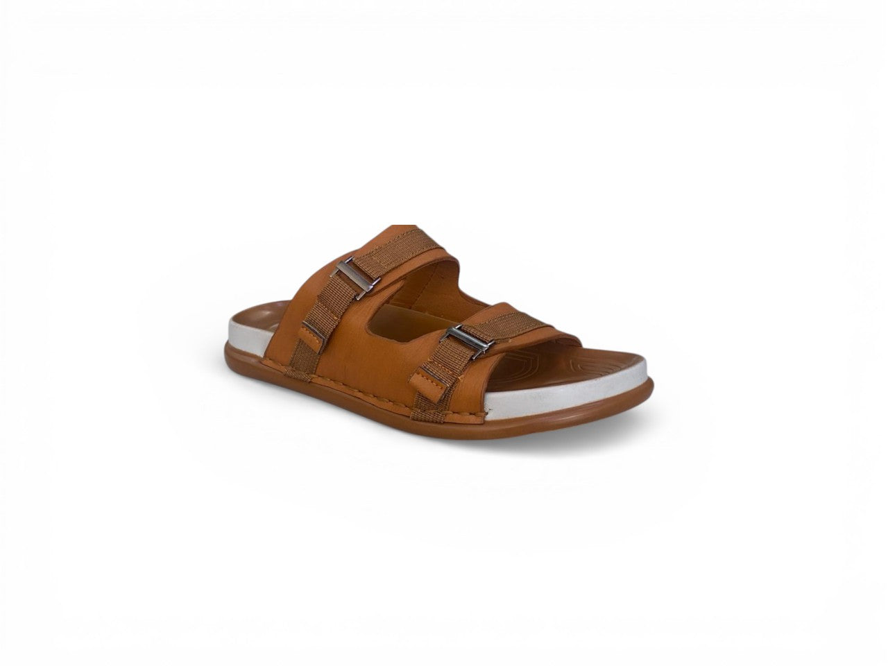 Men’s double-buckle slide sandals combining timeless aesthetics with contemporary comfort engineering. Dual adjustable straps featuring metallic buckles enable precise fit customization, while the ergonomic footbed delivers sustained support throughout extended wear. The tan synthetic upper contrasts elegantly with a resilient white EVA sole, creating a refined silhouette that transitions seamlessly from casual denim to traditional garments. Engineered for lightweight performance without compromising durability, these sandals excel as everyday footwear for both relaxed environments and social occasions.