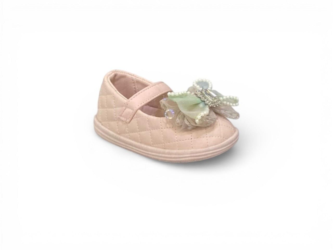 This exquisite quilted pump combines timeless elegance with practical comfort for your baby girl’s most memorable moments. The sophisticated matelassé quilting pairs beautifully with an ornate multi-layered floral and lace bow, creating a refined aesthetic perfect for formal occasions. The secure Mary Jane strap ensures stability during those early walking stages, while the soft, flexible sole supports natural foot development. Ideal for weddings, celebrations, and special family gatherings, this pre-walker delivers both style and functionality in one charming design.