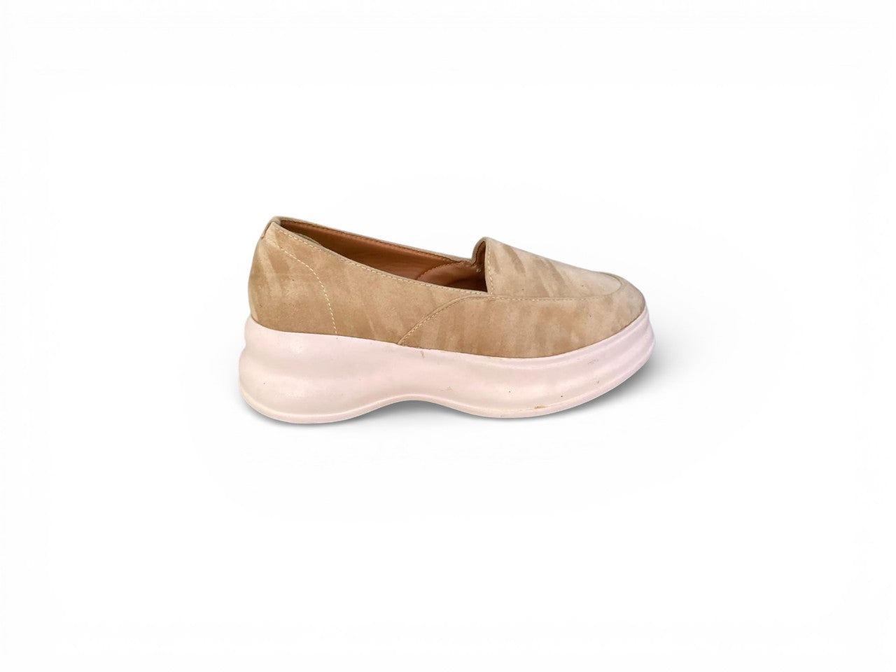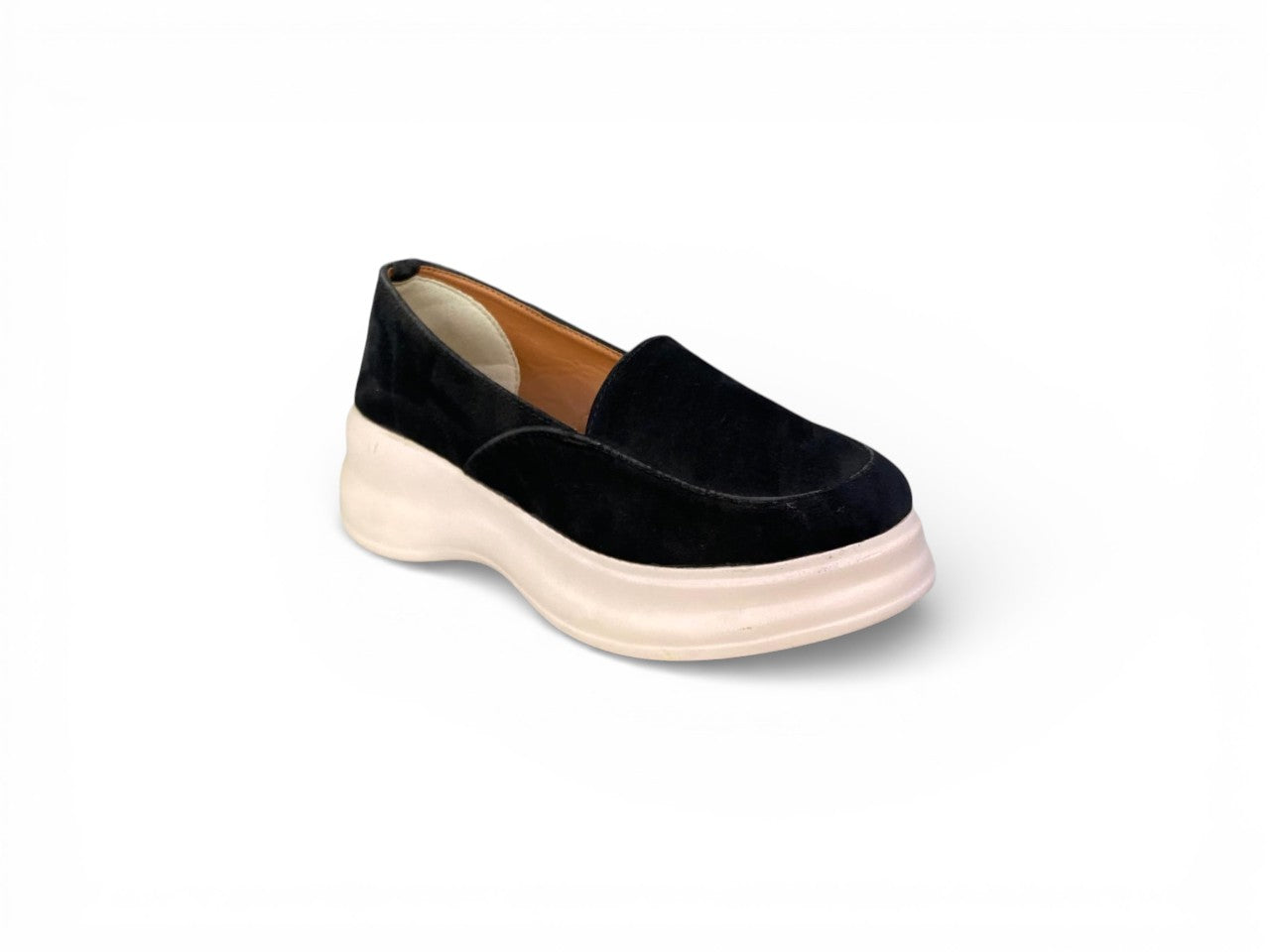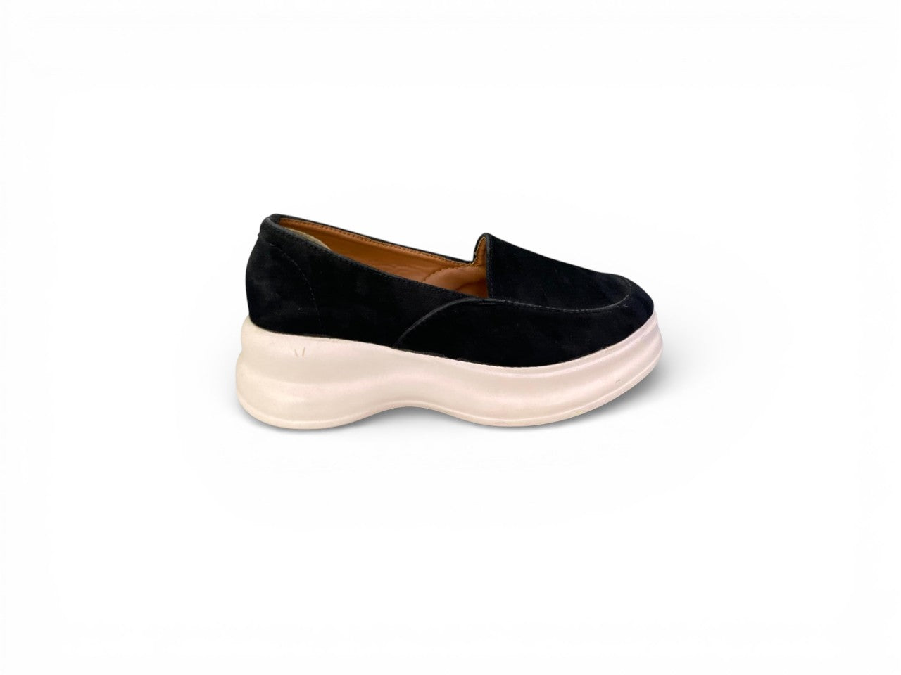 Effortlessly stylish, this slip-on loafer combines contemporary design with practical comfort. The soft, textured upper sits atop a substantial yet lightweight platform sole, delivering both visual elevation and cushioned support. Elastic side gores ensure a secure, adaptive fit without sacrificing ease of entry, while the generously rounded toe accommodates natural foot movement. Its understated monochromatic palette and refined minimalist construction seamlessly transition from casual weekday wear to polished semi-formal occasions, making it an essential addition to any versatile wardrobe.