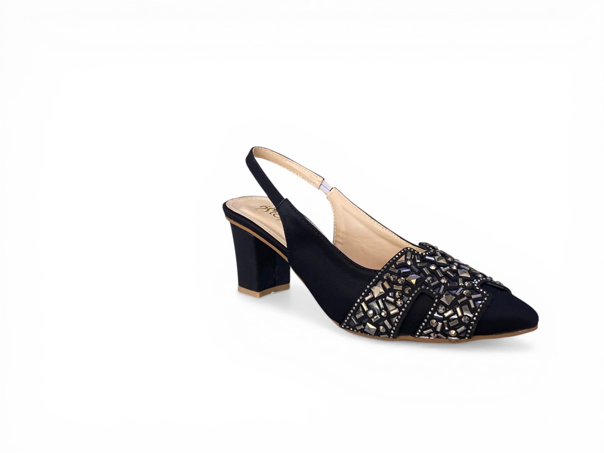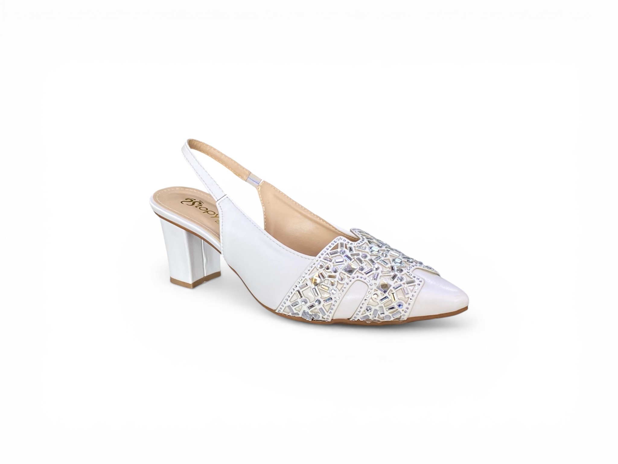 These elegant slingback pumps offer a blend of timeless sophistication and modern glamour, featuring a classic pointed-toe silhouette adorned with an intricate lace-inspired overlay and shimmering rhinestone accents. The ivory-toned upper is complemented by a practical low block heel that provides both stability and style, making them an ideal choice for weddings, formal galas, or professional settings. With an adjustable ankle strap for a secure fit, these versatile shoes effortlessly elevate any ensemble, from flowing evening gowns to tailored cocktail dresses.