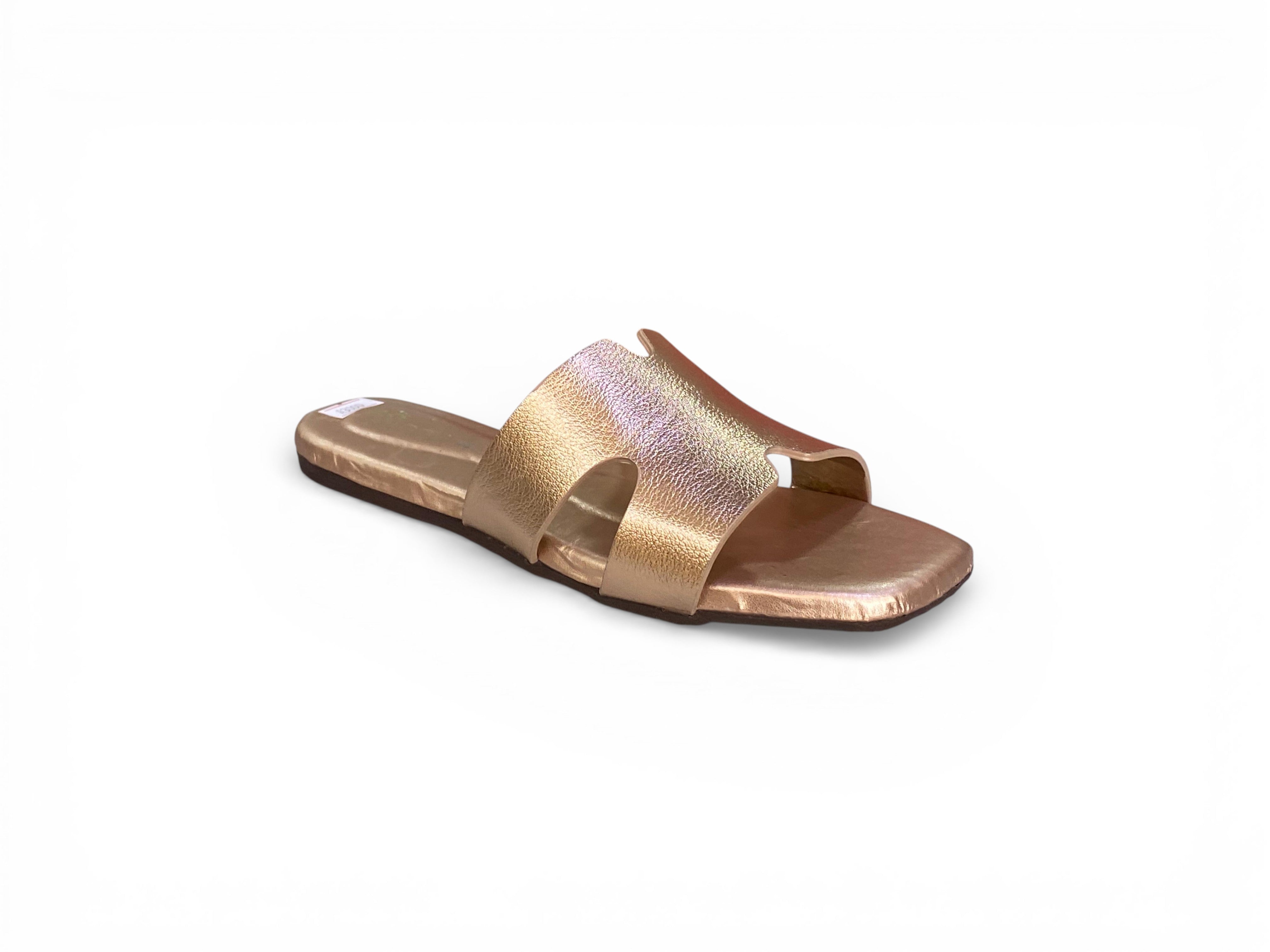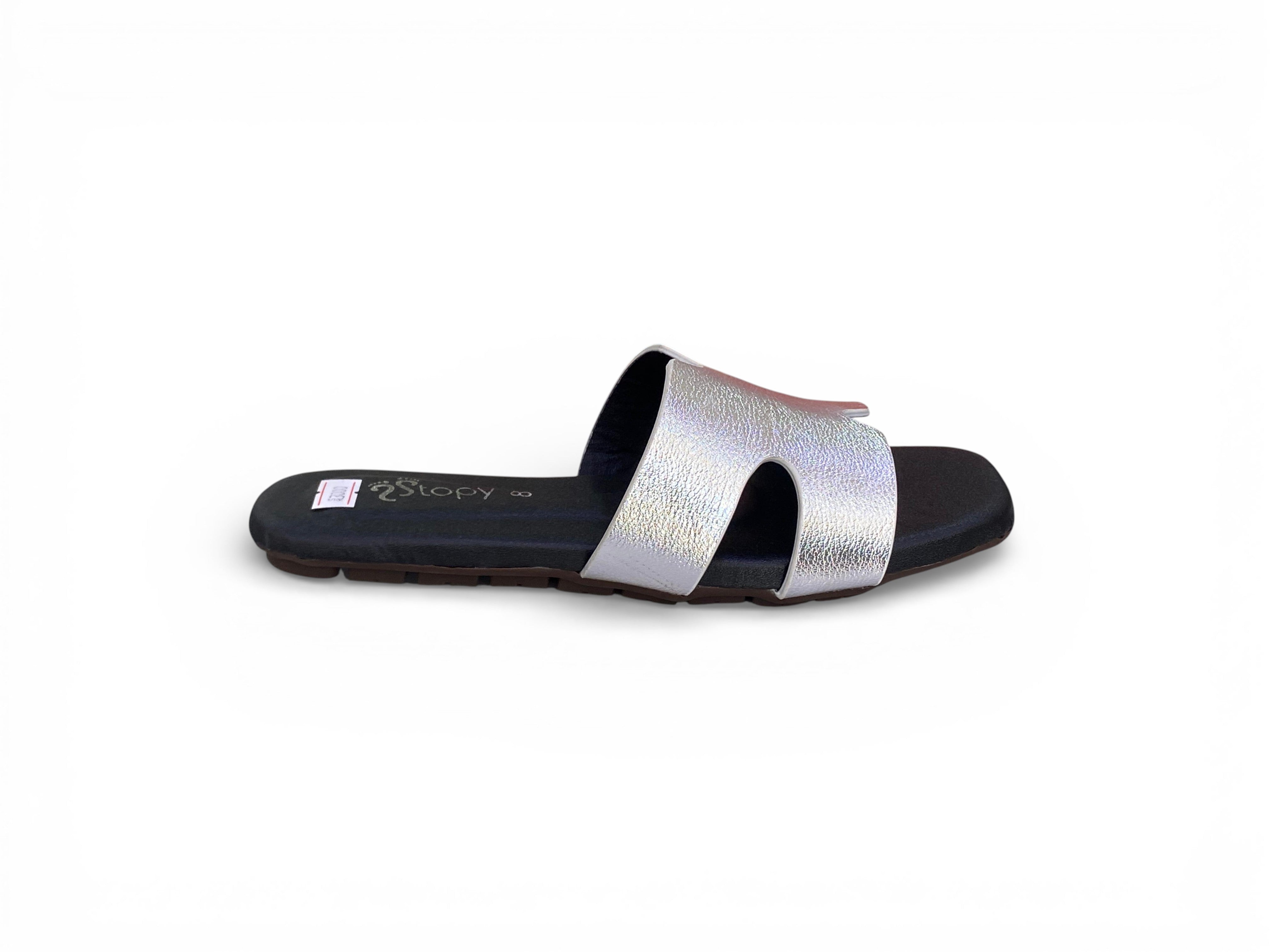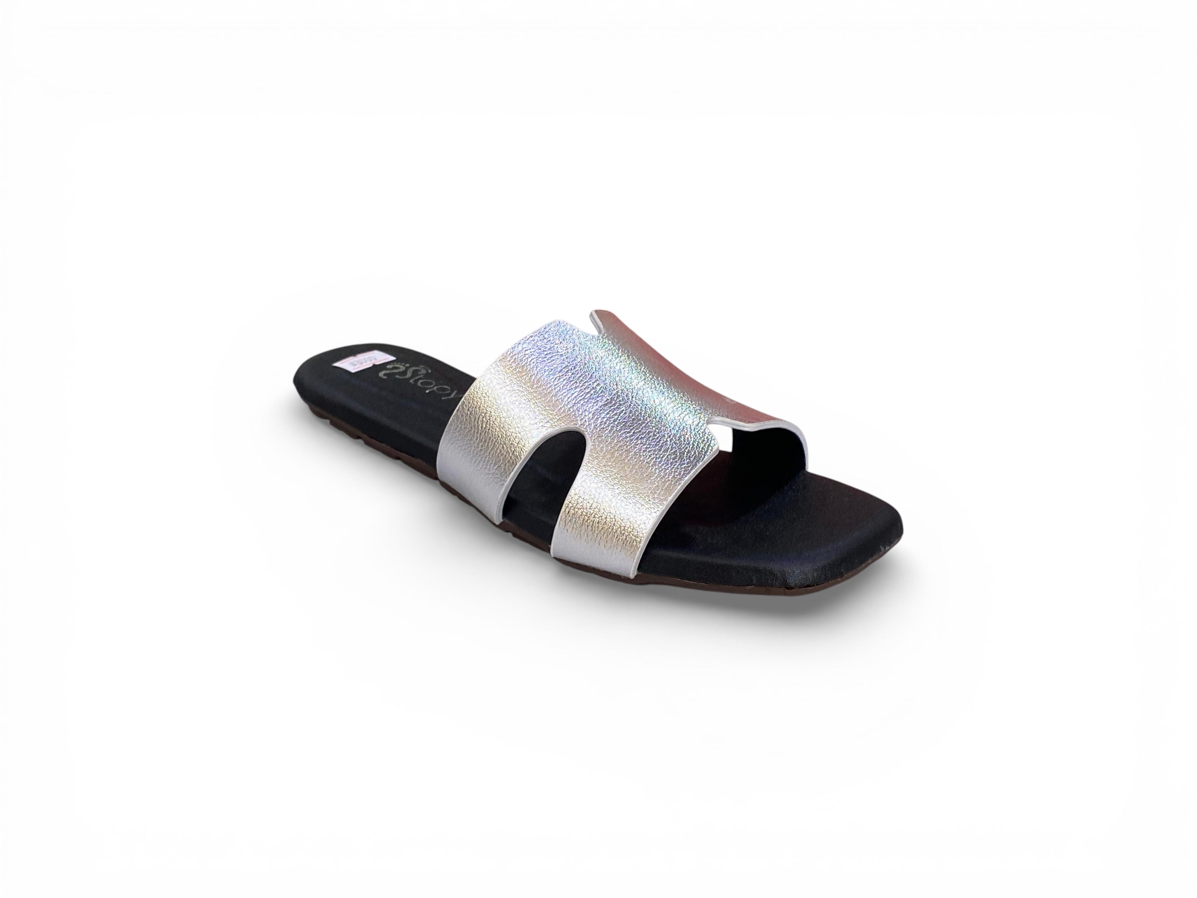 Elevate your everyday footwear with these minimalist flat slide sandals, distinguished by an iconic “H” cut-out strap that commands attention. The shimmering metallic silver upper delivers contemporary sophistication, beautifully offset by a cushioned black footbed for all-day comfort. Featuring a modern square-toe silhouette and flexible low-profile sole, these slides transition seamlessly from casual daytime wear to refined evening occasions. A masterclass in understated elegance and practical design.